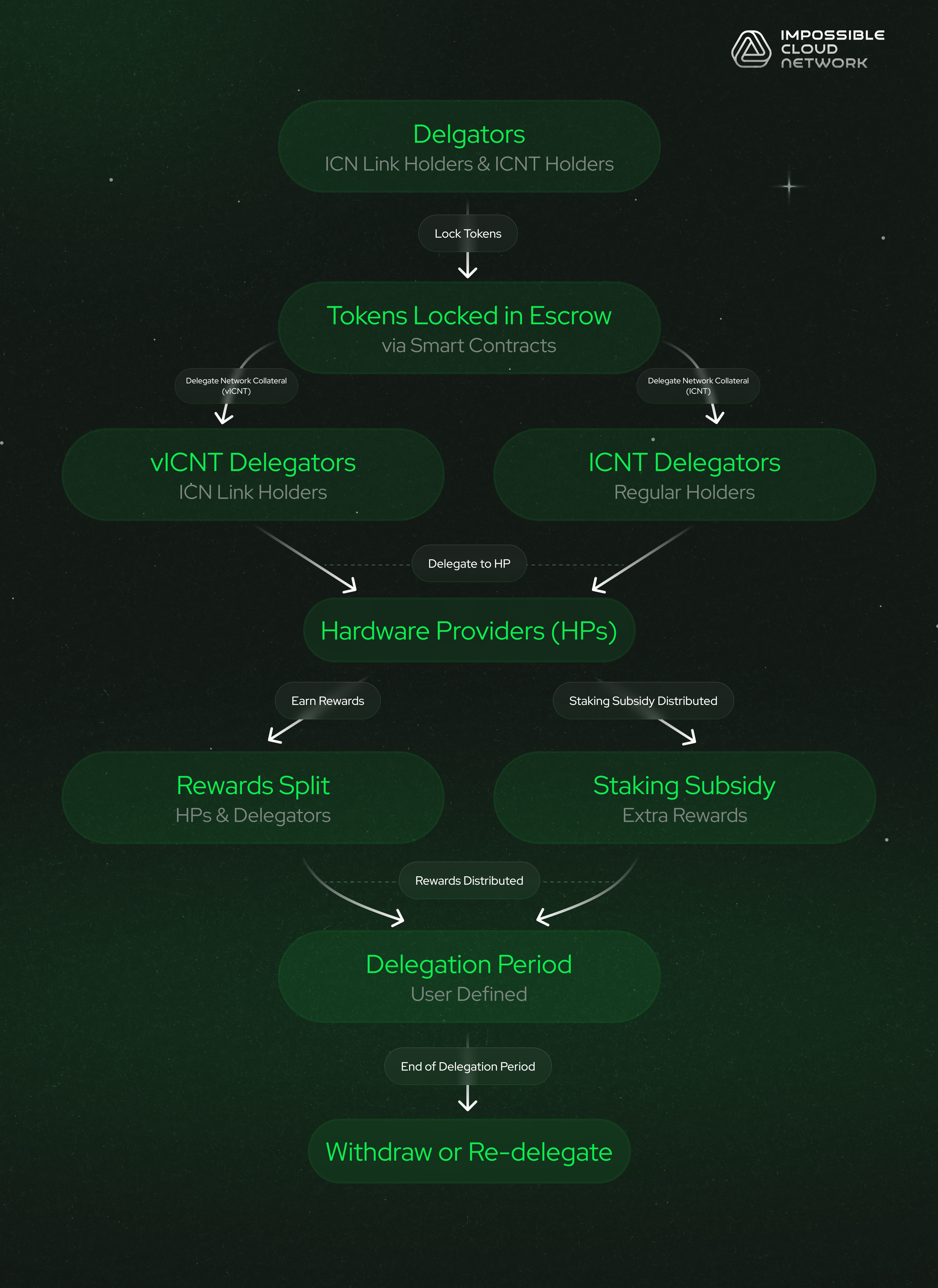 * **Delegating Locked Tokens (vICNT)**: Holders can delegate locked tokens (vICNT) during the lock-up period to provide Network Collateral to HPs.