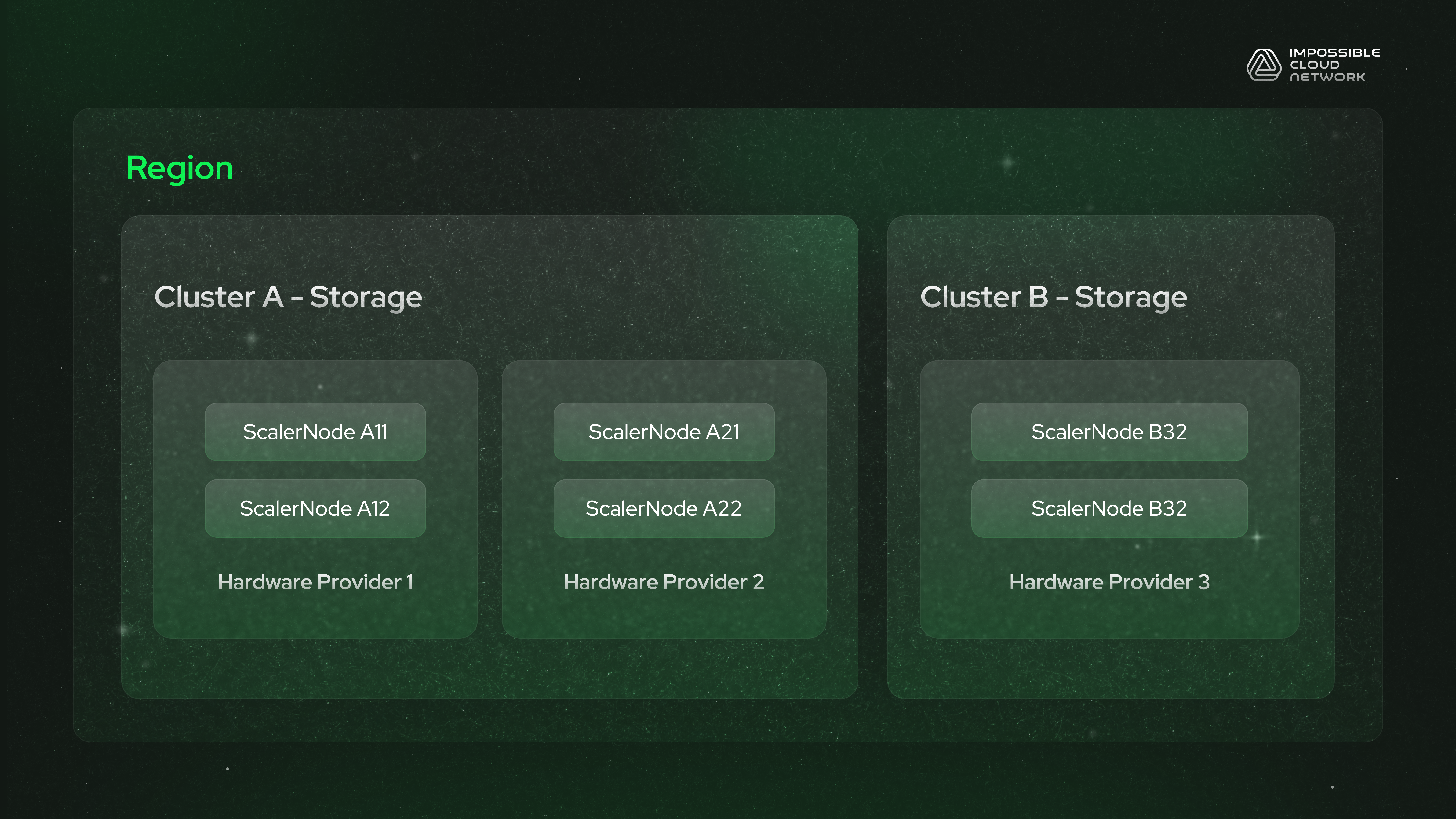 ScalerNodes are registered within regions depending on their geographical location, ensuring data locality and compliance with regional regulations. Within a region, ScalerNodes are then assigned to clusters based on their hardware class and other economic factors.